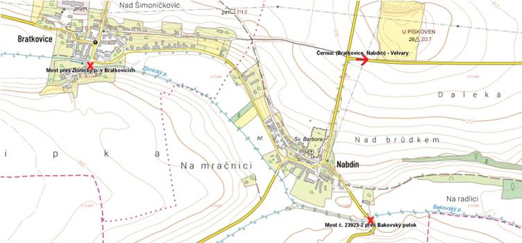 Pokud je neprůjezdný most přes Bakovský potok v Nabdíně (most č. 23923-2), přes který vede hlavní komunikace z Nabdína a Bratkovic do Velvar, je nutné použít jednu z alternativních tras, např. při cestě do Černuci zahnout z přímého směru v lokalitě U Pískoven a dále kolem Střelnice Velvary dojet až k silnici II/240 směřující do Velvar. Tuto trasu je nutné využít i při cestě do Velvar z Černuci, pokud je neprůjezdná silnice II/240 v místě, kde přechází Vranský potok.