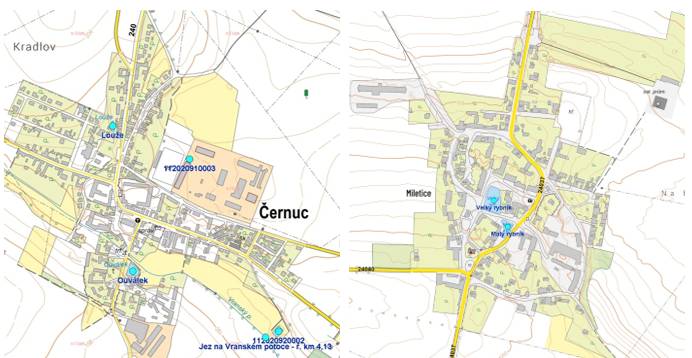 Mapa vodních děl v Černuci a Mileticích